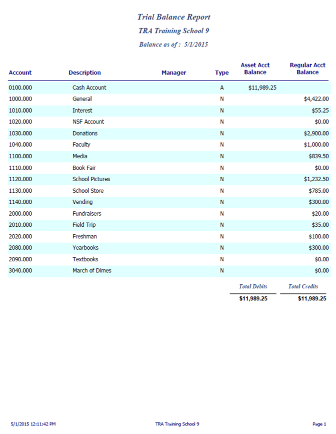 Trial Balance is a list of all active accounts with balances as of the current date. Debit and credit account balances are totaled at the end of the report.