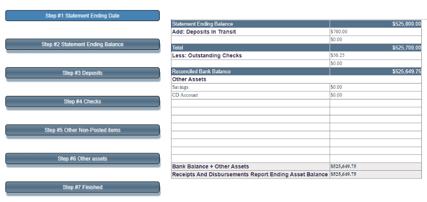 The Bank Reconciliation includes seven steps to guide you through the process. Each step has an on-screen link for additional help. When you complete a step, calculations automatically update on the right side of the screen.