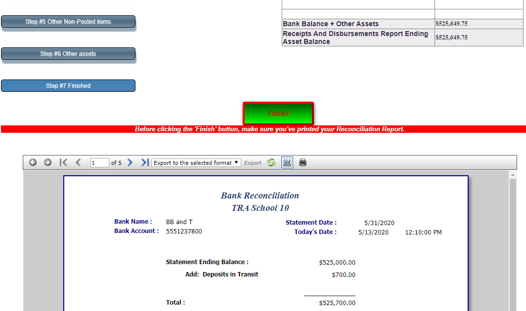 - If Step 7 says You are not in balance, review the Bank Recon Out of Balance Suggestions.