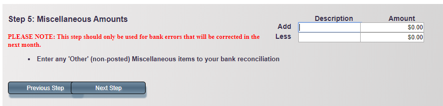 Use this step to record additions or deductions not yet posted, such as errors. Add a description and amount, then click Next Step.