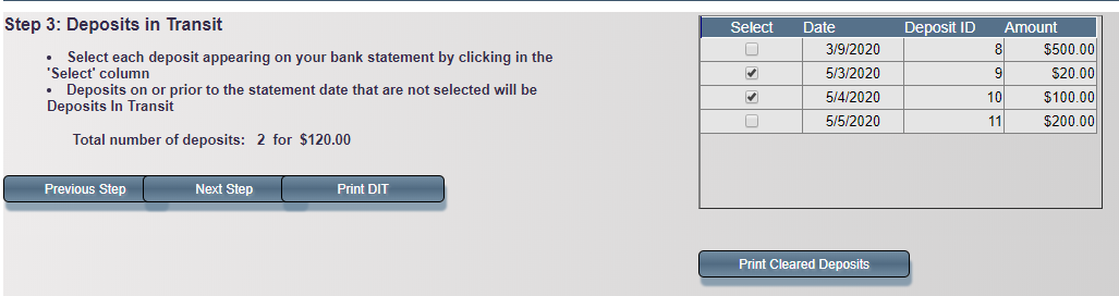 Compare deposits in the system to your bank statement and select the ones that cleared. Click Next Step when done.