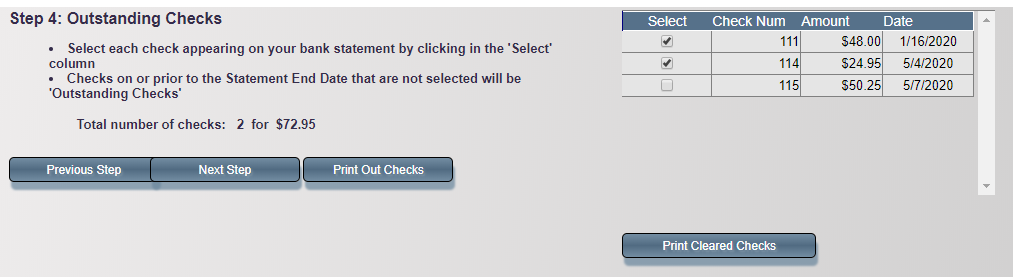 Compare checks in the system to the bank statement and select the ones that cleared. You can also clear any old outstanding checks. Click Next Step when finished.