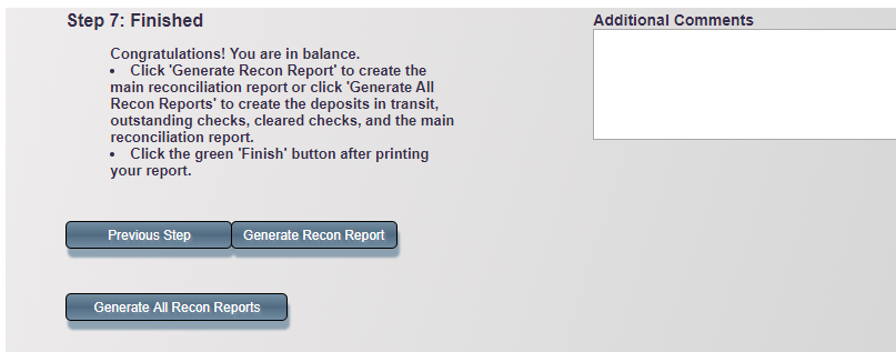 - If you already printed reports in Steps 3 and 4, use Generate Recon Report to print only the Main Bank Reconciliation Report.