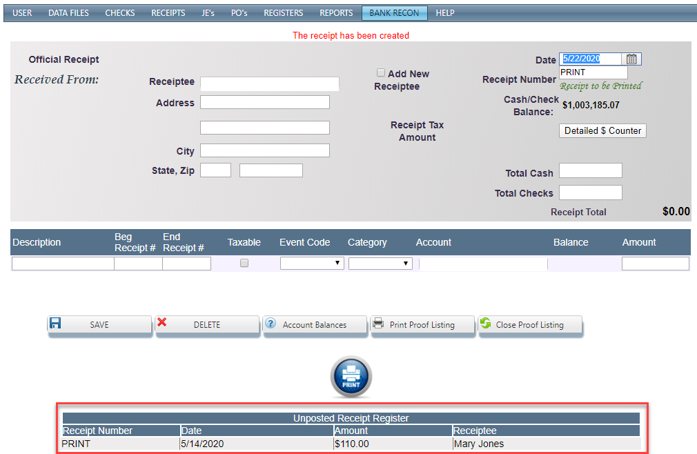 - The previously saved receipt information will display in the upper portion of the screen.
