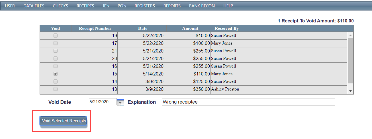 - The number and amount of receipt(s) to be voided will appear in the upper right corner.