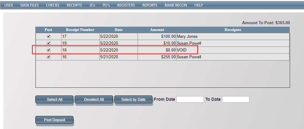- Once the deposit is posted, go to Receipts > Void Receipt