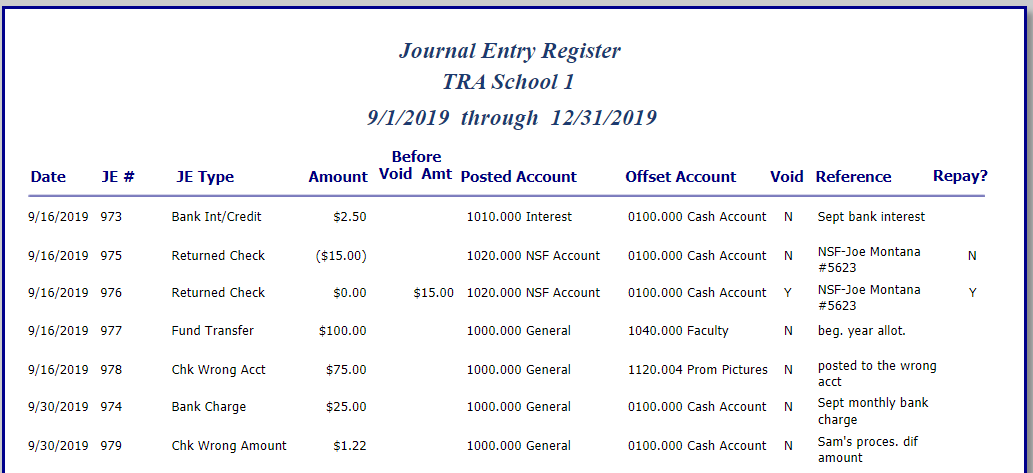 After journal entries have been printed and posted, a Journal Entry Register may be printed for documentation.
