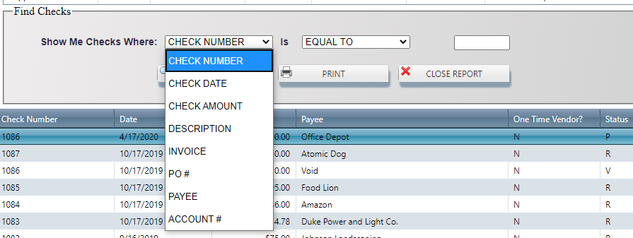 Checks can be searched by Check Number, Check Date, Amount, Description, Invoice, PO #, Payee, or Account #. Type the data you are searching for in the data entry box to the right, then click the Find button.