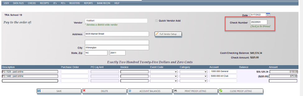 Enter the Check Number (most schools will use the invoice date as the check number.